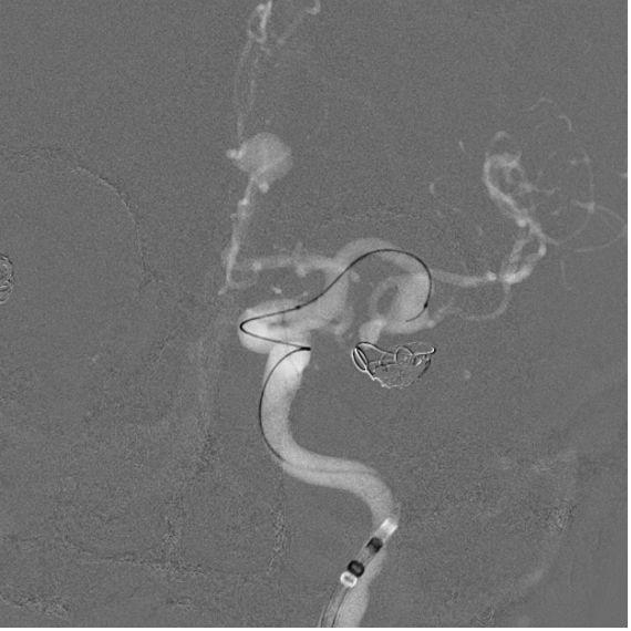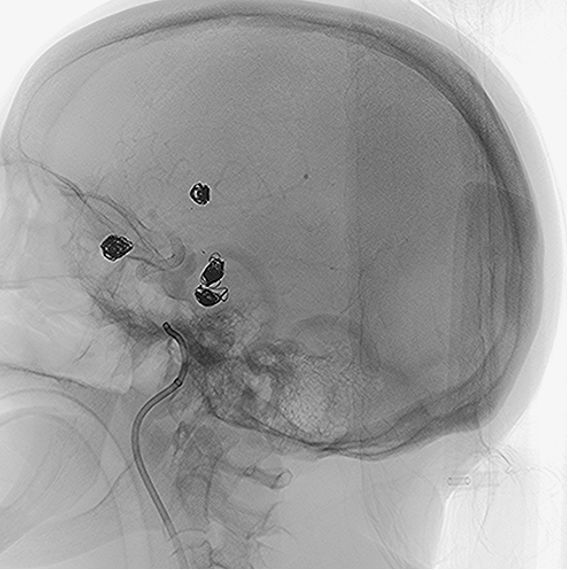 • The neck of another aneurysm in the pericallosal artery was protected with a 10mm PCONUS intrasaccular device, and successfully embolized with 3 coils.